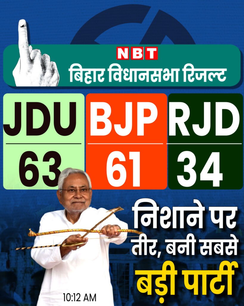 NBT के अनुसार, बिहार विधानसभा चुनाव के प्रारंभिक परिणामों में जेडीयू (JDU) ने 63 सीटों पर जीत हासिल करके सबसे बड़ी पार्टी बनकर उभरी है। वहीं, बीजेपी (BJP) को 61 सीटें मिली हैं और आरजेडी (RJD) को 34 सीटें ही मिल पाई हैं।